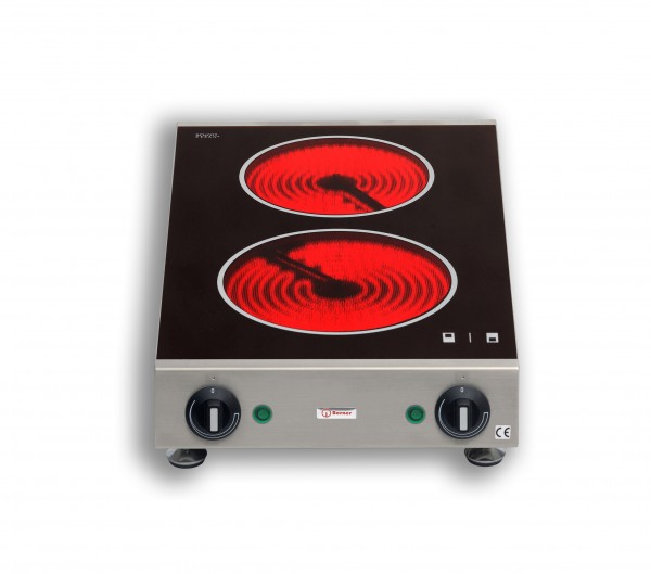 Preiswerte Glaskeramik-Doppelkochplatte BS2SK von Berner Induktion. Top Qualität und Leistungsfähigkeit Made in Germany. Steckdosentaugliches Cerankochfeld mit zwei Strahlungsheizzonen mit 18 und 20 cm Durchmesser für vielfältigste Anwendungen in der Gastronomieküche und in der Hotellerie.